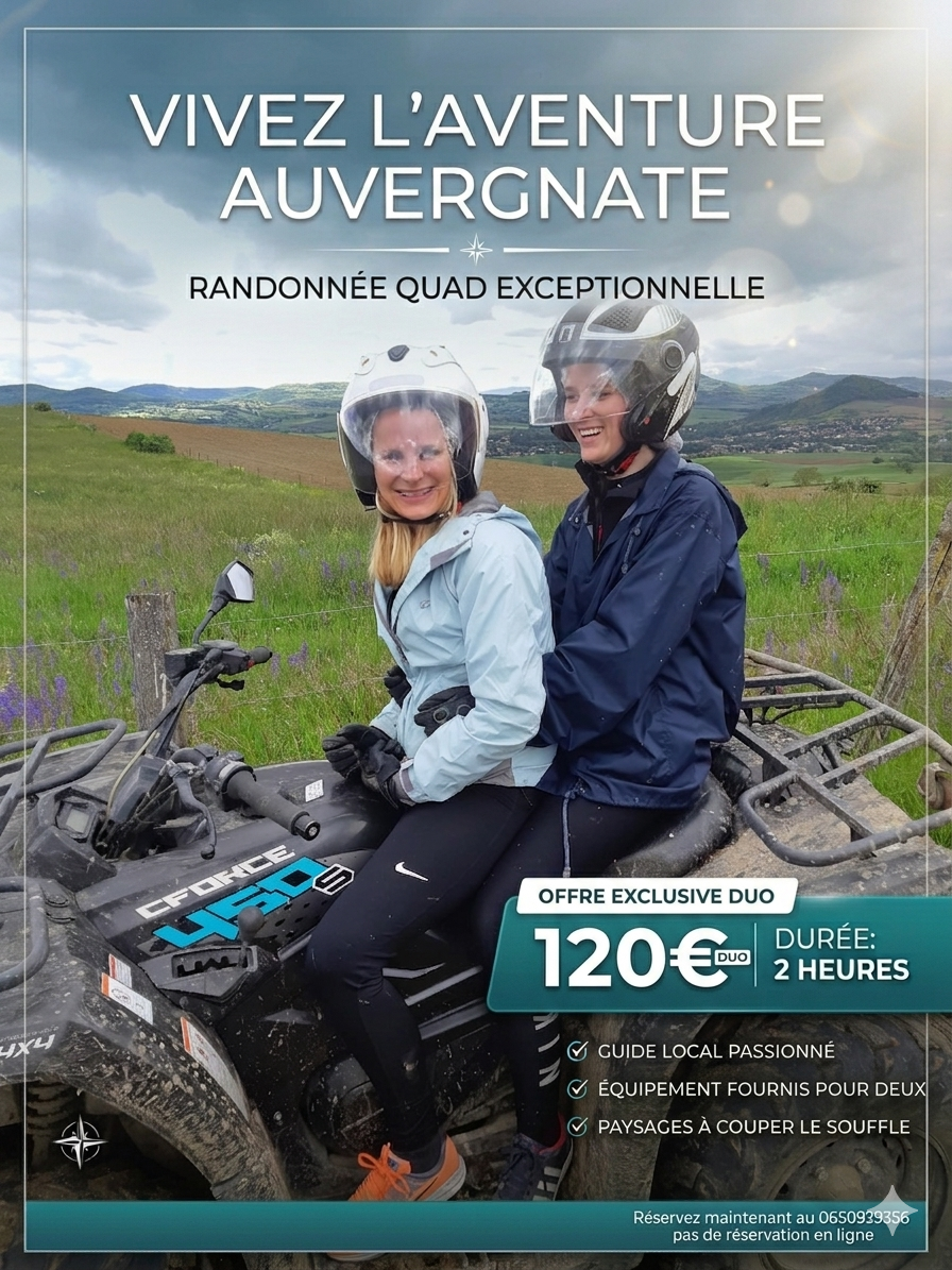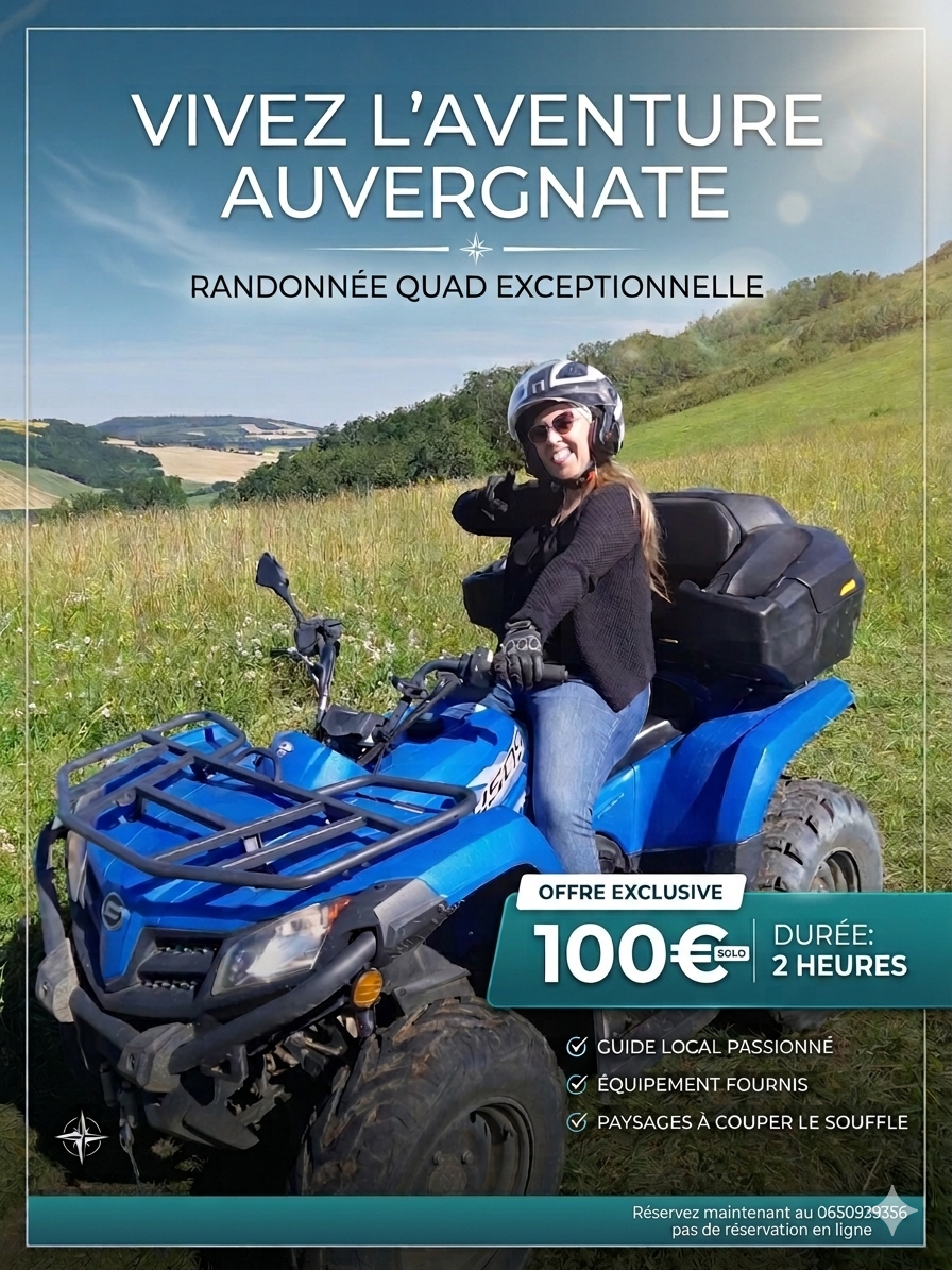 Vous cherchez une location de quad, venez découvrir nos randonnées touristiques, dans la toscane auvergnate et dans le parc du Livradois-forez, à quelques minutes de Clermont-Ferrand et 1h40 de Lyon. Visité l’Auvergne autrement, au départ de Billom avec chemins roulants, sous bois avec passages techniques pour les plus aguerris et admirer les magnifiques paysages, avec une vue panoramique sur la chaîne des puys.